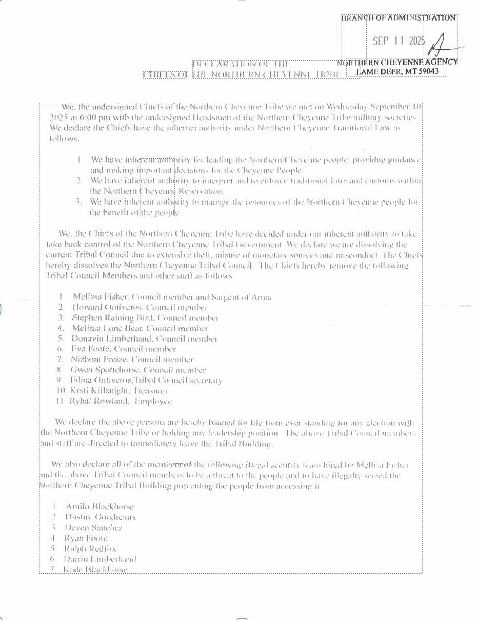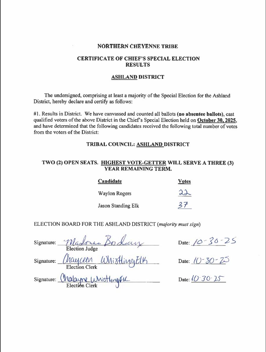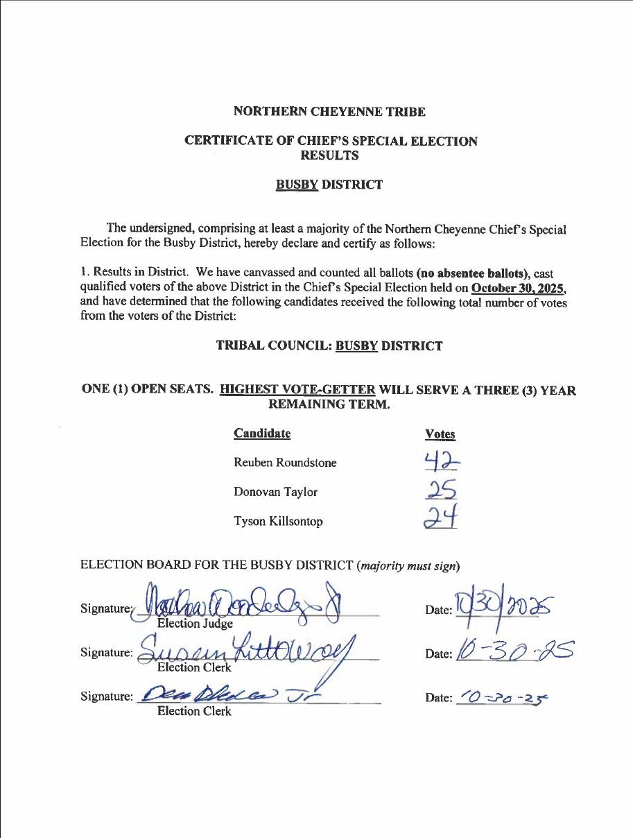 Constitution and By-Laws of the Northern Cheyenne Tribe of the Northern Cheyenne Reservation The Northern Cheyenne Tribal Council consists of members elected from each of the following districts: Ashland, Birney, Busby, Muddy, and Lame Deer. The President and the members of the Tribal Council serve four year staggered terms.