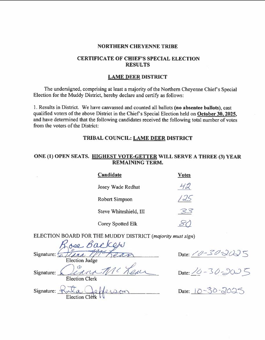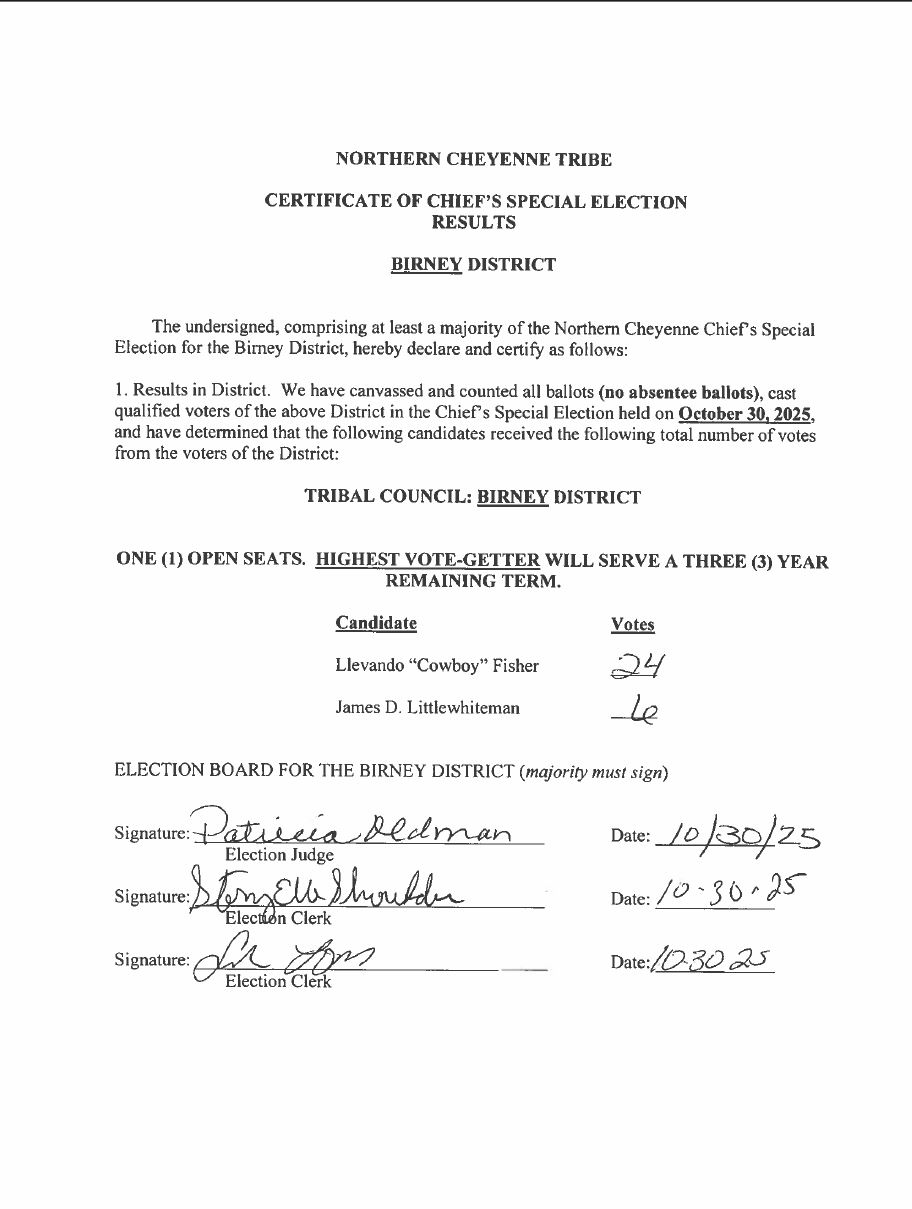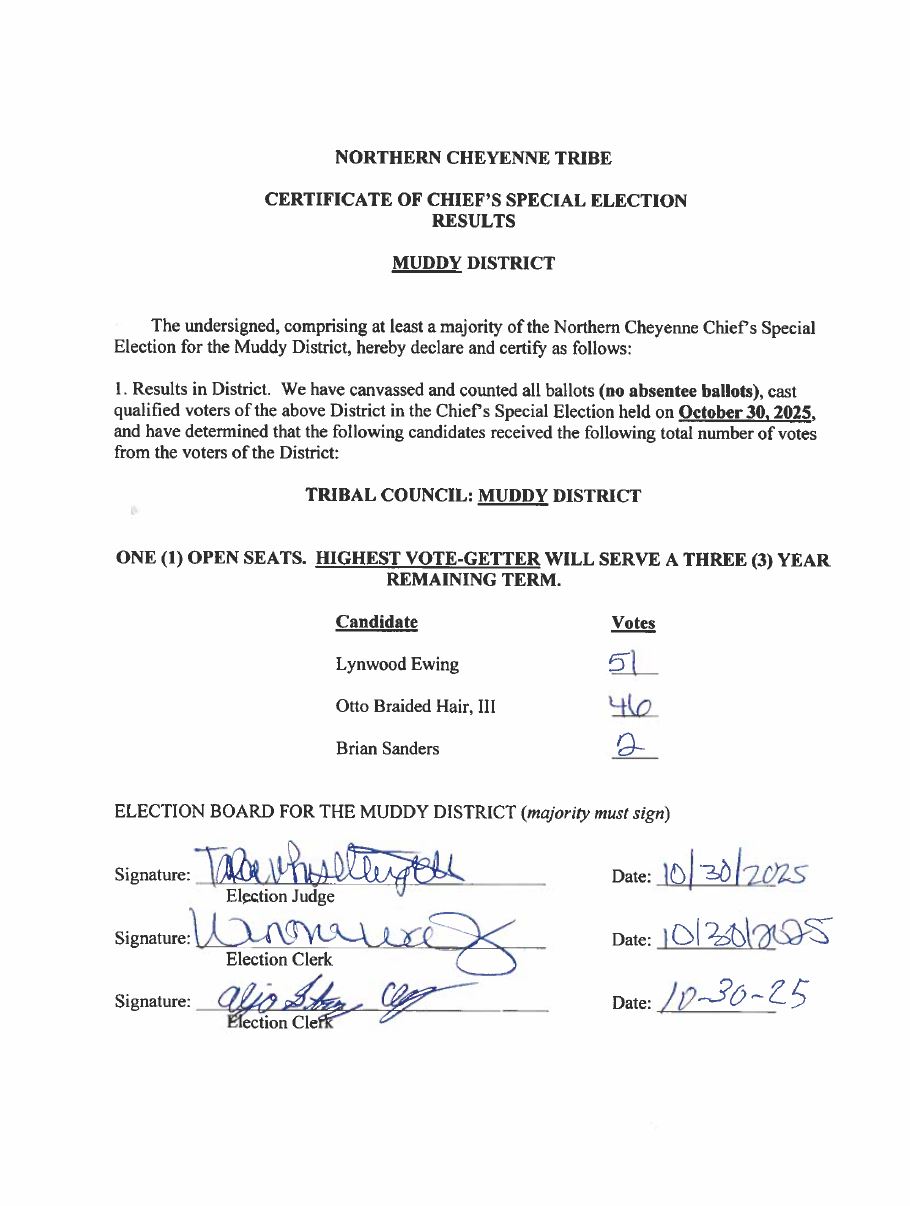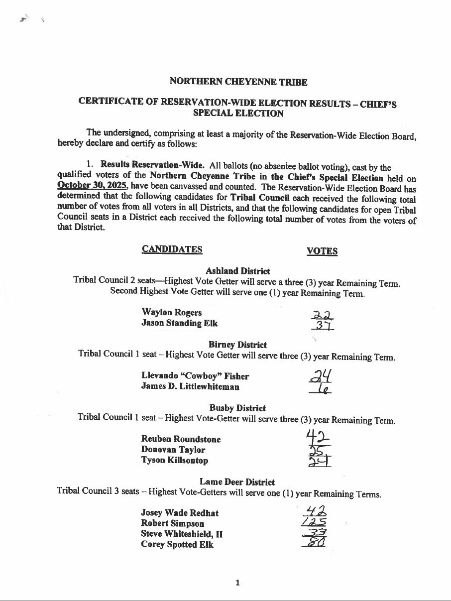 Constitution and By-Laws of the Northern Cheyenne Tribe of the Northern Cheyenne Reservation The Northern Cheyenne Tribal Council consists of members elected from each of the following districts: Ashland, Birney, Busby, Muddy, and Lame Deer. The President and the members of the Tribal Council serve four year staggered terms.