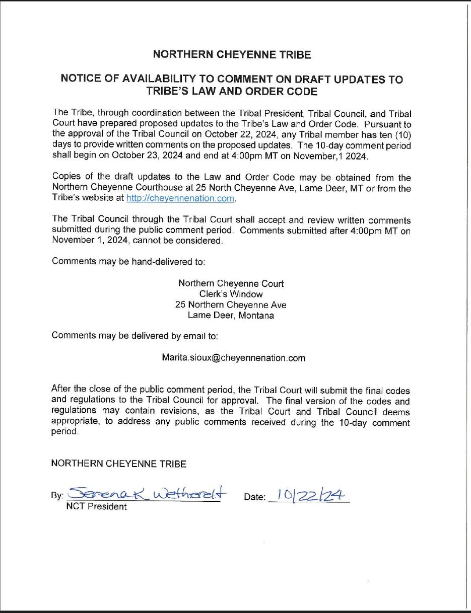 Notice of Availability to Comment on Draft Updates to Tribe's Law and Order Code